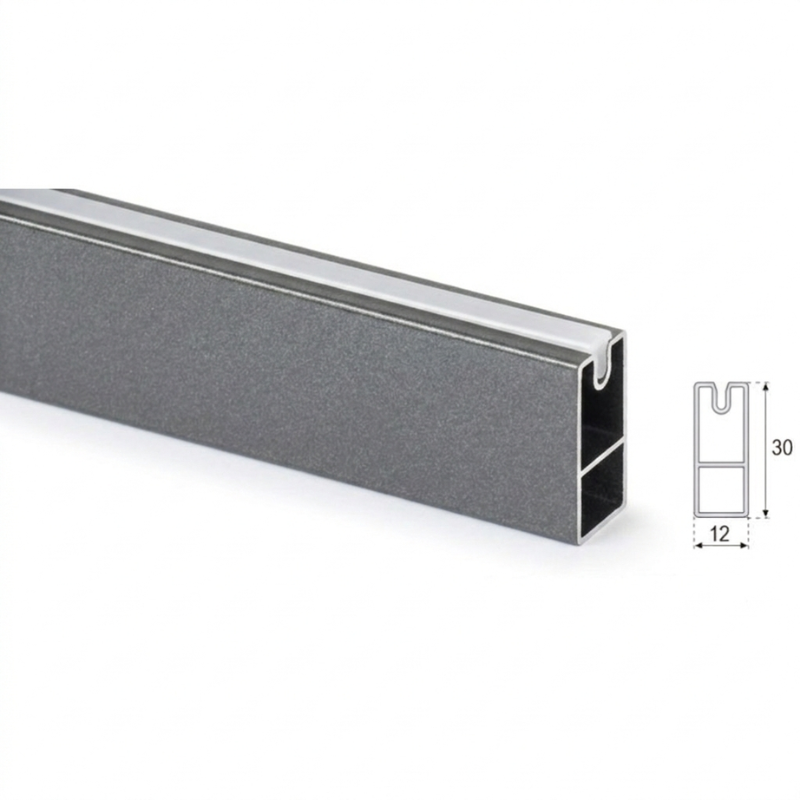 Barra rectangular de acabado Grafito de 1,95 m de longitud, con sección de 30 x 12 mm, ideal para colgar ropa en armarios y vestidores. Resistente, ligera y fácil de instalar.