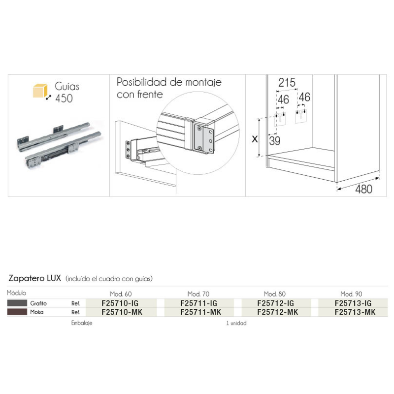 Se adapta al ancho del módulo y está disponible en acabado grafito y moka, ofreciendo una solución ordenada, accesible y moderna para armarios y vestidores.