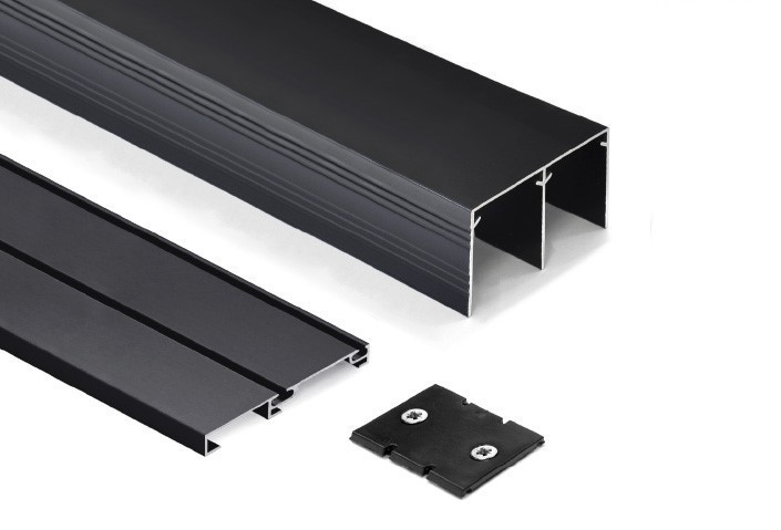 Incluye perfiles tirador verticales, guías superior e inferior y frenos amortiguadores, todo en acabado Negro mate.