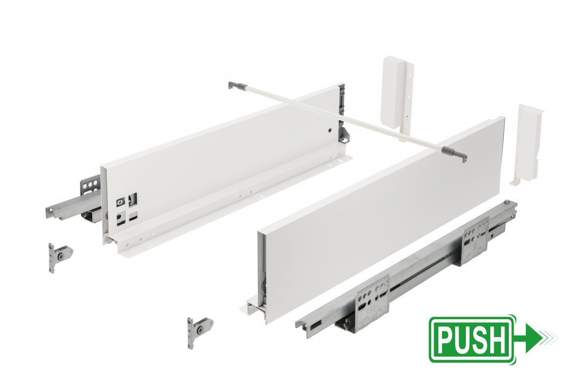 Kit de Cajón con guías PUSH con laterales de pared metálica fina de 14 mm y altura 116 mm.