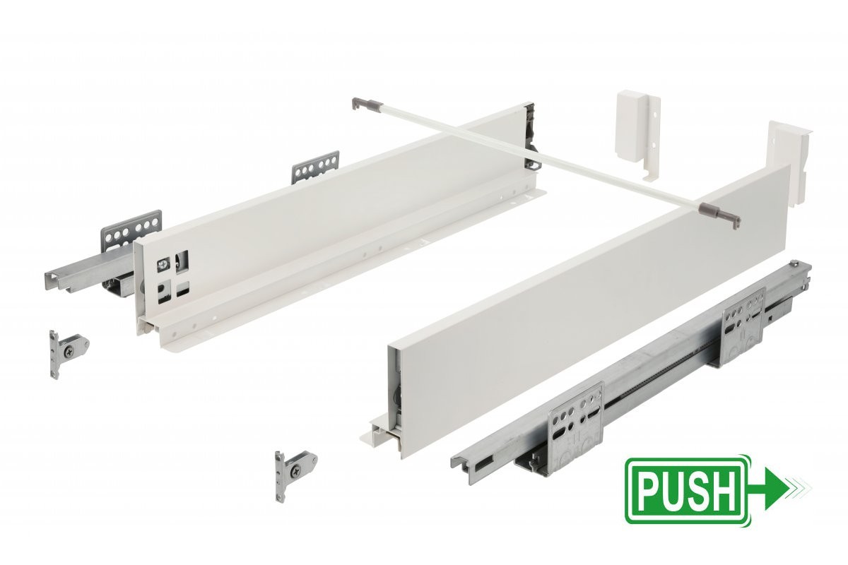Kit de Cajón con apertura y cierre PUSH con laterales de pared metálica fina de 14 mm y altura 84 mm.