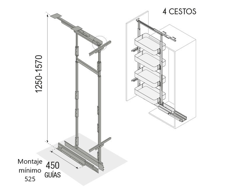 Esta columna extraíble dispone de 2 alturas extensibles, de 122 a 155 cm (4 cestos) y 182 a 215 cm (6 cestos).