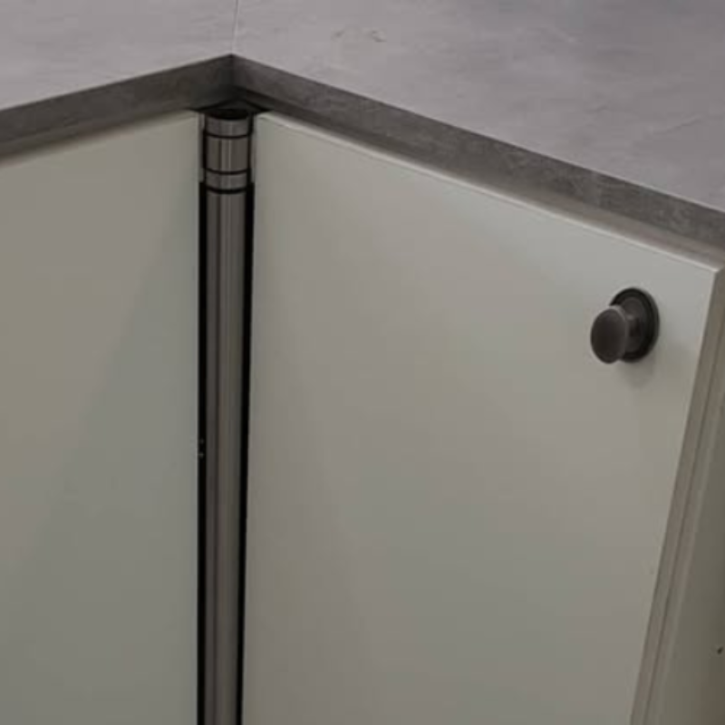 La Bisagra Movi-Córner está diseñada para unir dos puertas en muebles de rincón con apertura en el mismo sentido, ofreciendo una solución práctica, estética y funcional para cocinas y muebles de esquina