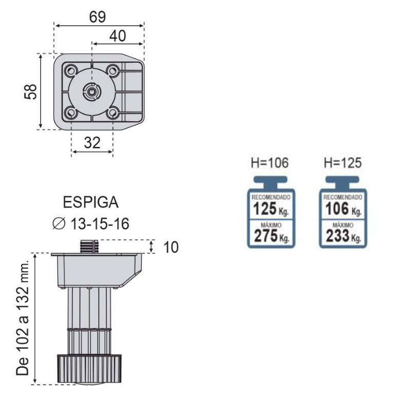 Pata Módulo Glamour H102/132 mm (Kit 4 unds)
